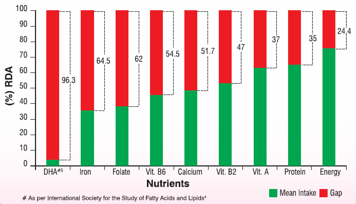 Countrywide surveys conducted by the National Nutrition Monitoring Bureau (NNMB) show that Indian diets are qualitatively adequate in proteins but deficient in some micronutrients. The study also indicated that the intake of iron, folate, vitamin B6 and calcium is less than 50% RDA. The intake of DHA is far below the WHO recommendations.